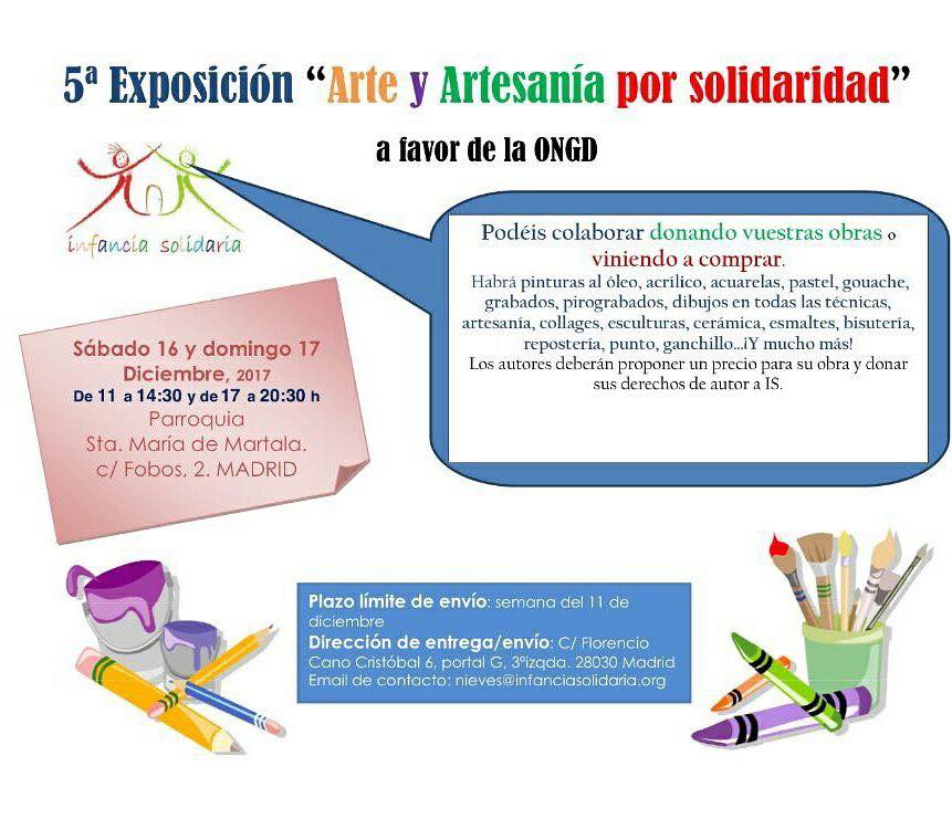 El 16 y 17 de diciembre hacemos nuestra 5 Exposición de “Arte y Artesania por Solidaridad”. En breve crearemos el evento para que podáis ir viendo todo lo que nos donan. De momento, por favor, difundidlo para que todos los que nos ayudáis con vuestras obras y creaciones, tengáis tiempo para terminarlas. ¡Animaros! Ya sabéis que podéis colaborar de muchas maneras.